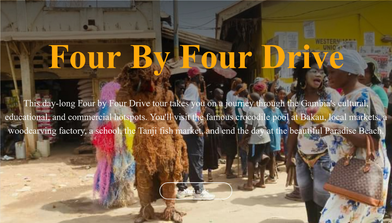 The next stop will be at serekunda one of the largest town in the Gambia, where you will have a work through the local market and see how local woman goes on their daily activities to make a living. A visit to a local school to learn the educational system, and the level of education in the school.